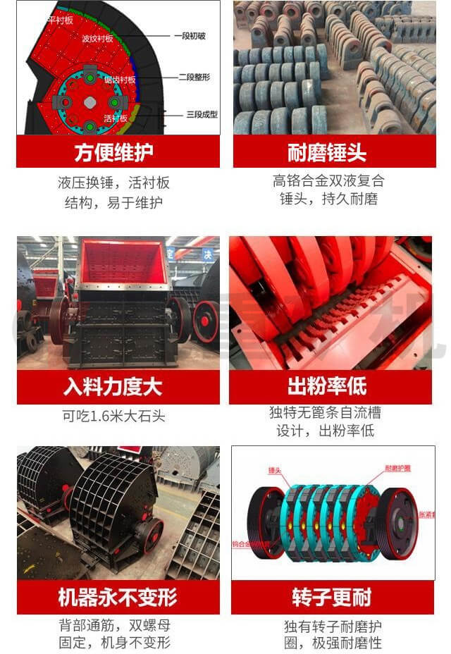 重錘式破碎機采用無蓖條設計,產量大,無堵塞,出料可調。一破成型替代顎式破碎機與反擊式破碎機的聯合作業與傳統錘破相比,昆重礦機采用獨特無蓖條設計,通過調整活動反擊板與轉子上錘頭回轉軌跡圓之間的距離,調整出料粒度的大小,大大降低出粉率,揚塵大大減少,更環保實用。進料口大具備鄂破可以吃大料功能,同時具備反擊破整形功能。同時可破碎濕料,下雨天不影響生產,解決了傳統錘破易堵塞、易卡機、產量低的難題。